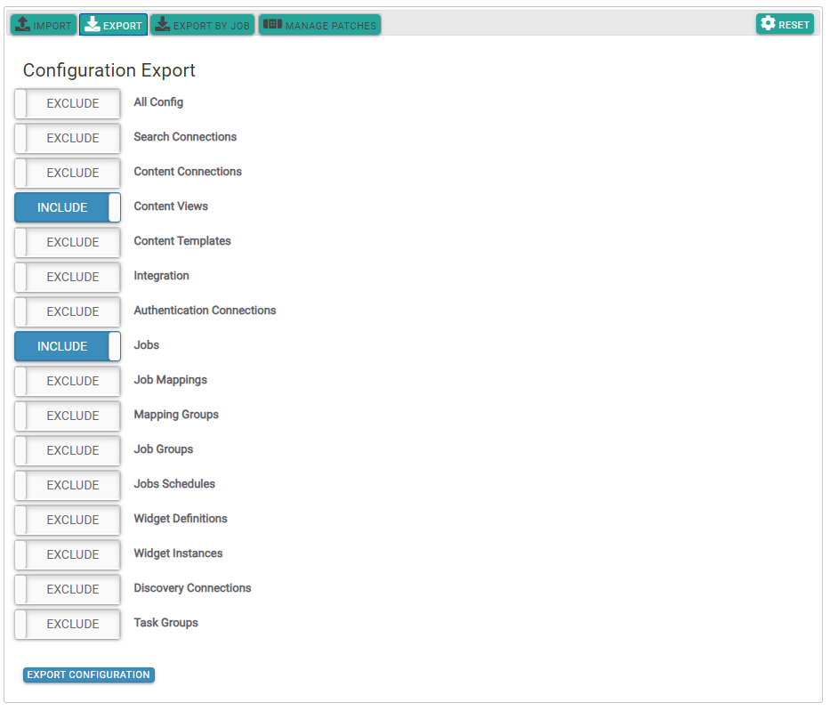 Move the sliders from exclude to include for all of the configurations you wish to export. You can select All config to export all of your 3Sixty Configurations or you can select certain sections that you wish to export such as connectors and jobs. Click the Reset button to deselect the chosen options and refresh the page.