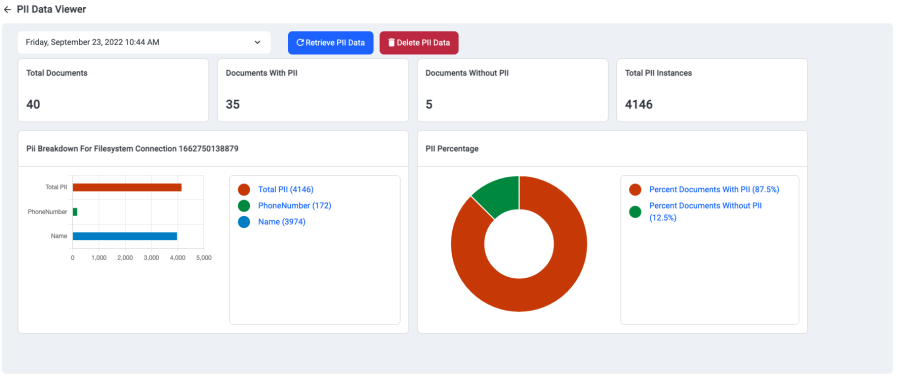 The PII Scan feature allows the user to select a configured repository connector and job, then scan the repository for Personally Identifiable Information (Pii).