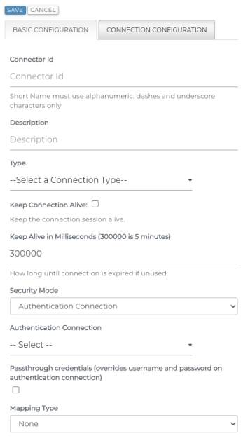Different connectors might require additional configuration. These values will populate after selecting a Type.