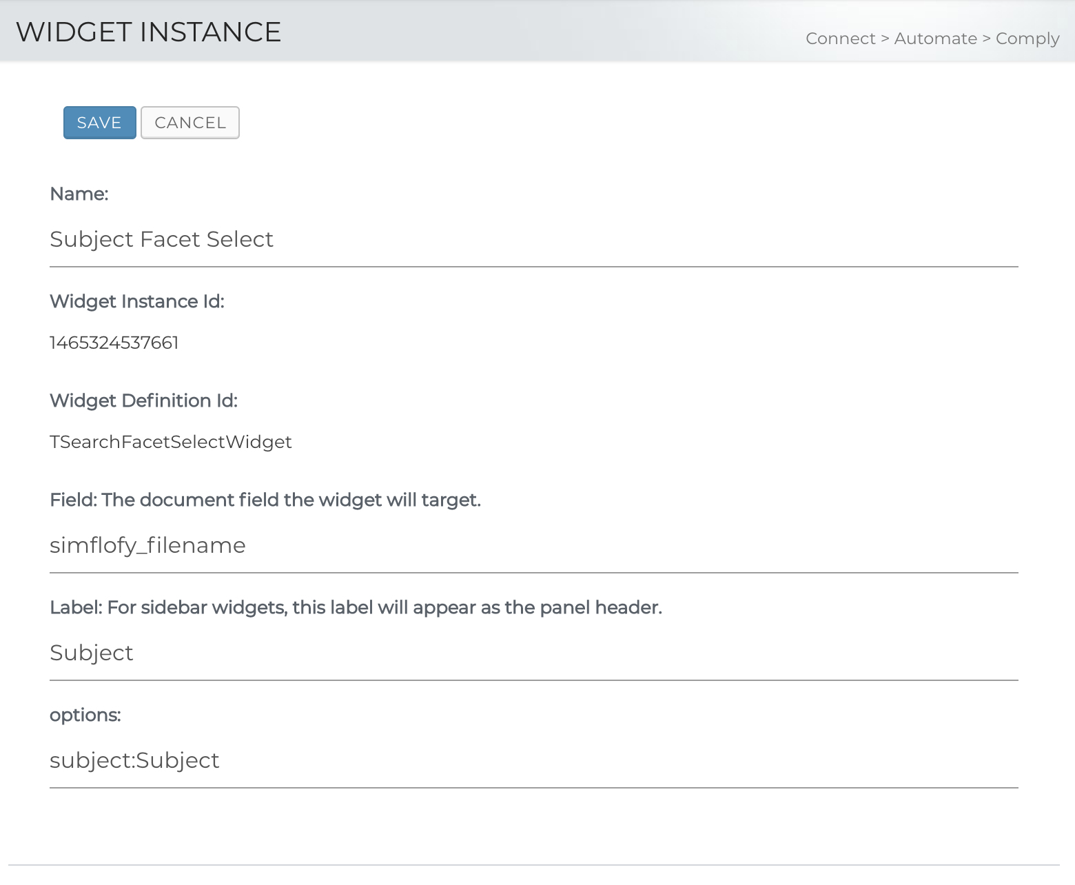 To make changes to a widget instance click the edit button. Make any necessary updates and click save. You will need to republish any templates that have the widget in use in order to see any changes reflected in your Discovery environment.