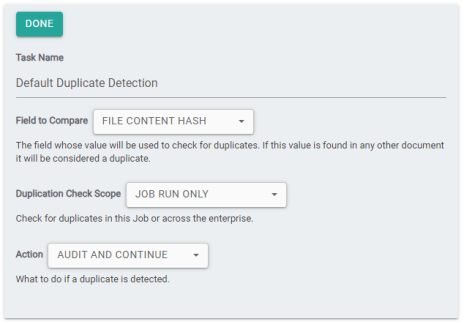 Configuring the task following the first image will tell 3Sixty when the job runs, compare the hash fields to the other documents in the job run. If a duplicate document is found, make a note of it in the job's audit and continue to run the job.