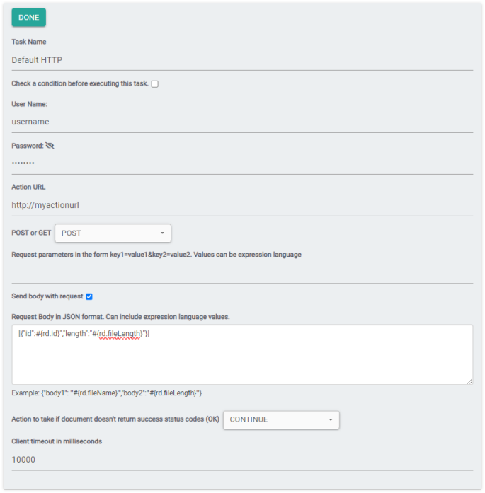 Following is an example of how to configure the HTTP Task. We are sending a JSONArray as the body. This array will contain a single objects which contains the id and file length of the document. The example given also shows the same object without wrapping it in an array. Both are valid and will be checked for correct JSON syntax.