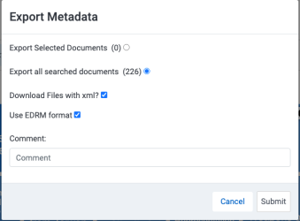 Download Files with XML: This option will batch the selected files with the metadata export as a zip file. If selected you will have two options Download selected documents: Download only the currently checked documents Download all searched documents: The current search will be executed again and all returned documents will be downloaded.
