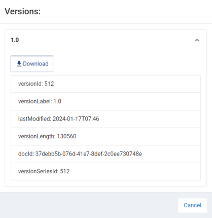 If the content service connector of the document supports versioning, the Version Info Widget will allow users to view the version information for a document. A list of version information will be returned. Optionally, a download button can be added to retrieve the specific version. This widget will call the ListVersionscontent services method.