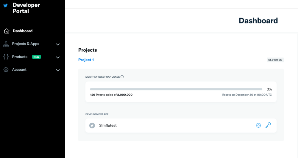 Get a Developer Account, by clicking "Sign Up" here you will be asked to create a project and a development app during this process. Twitter may offer you your API Key, Secret, and Bearer Token as this point. Save them for later. With all that done, you should see the dashboard, which will look like this.