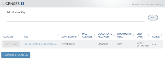The Licenses page allows for management of your License Keys. You can add a new License key, or reactivate previously entered keys. The details of each key are listed, including the associated MAC Address, Documents Allowed, Documents Used, End Date and which key is in use.