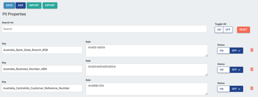 From the PII Properties page under the Admin section, users have the ability to add, edit and remove PII configurations. These properties capture specific personally identifiable information when running the PII Task or PII Scan. This is done using Regulars Expressions (RegEx). We recommend testing PII Properties in an external RegEx tester before modifying these properties.