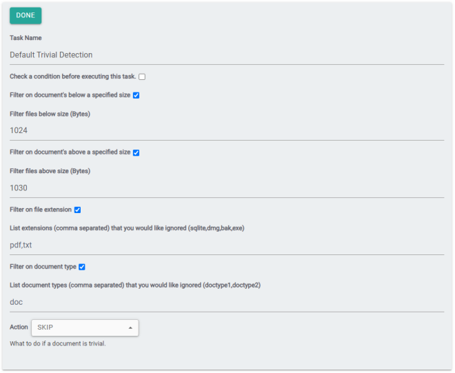 The trivial task can be used to identify content that is trivial in nature (as it holds no importance from a corporate knowledge perspective). The definition of trivial depends on your organisation. You can set whether you want to filter on documents of certain sizes or if you want to filter out files with certain extensions or document types. For example, dmg, and exe are installers and may hold no corporate importance so you may want to skip such content from being registered as a record, you can now do so by adding them to the filtered list of extensions.