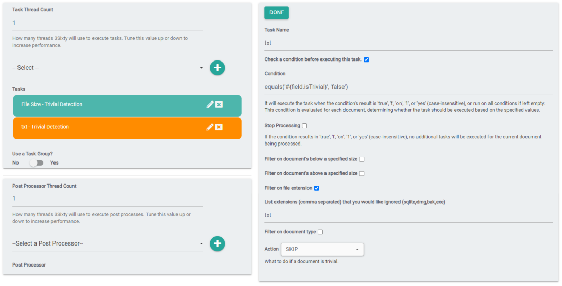 To chain trivial tasks, so that 3Sixty will identify trivial files that match either task, use the condition check by entering the value equals('#{field.isTrivial}', 'false')