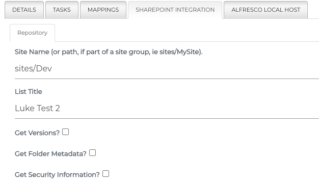 Next, scroll up to the top and click the tab with the same name as your repository connection. In my case, SharePoint Integration. Ensure that: