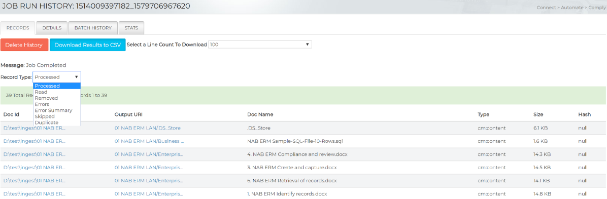 The Records tab will give you a list of all of the documents that have been processed through this job run. This list can be filtered by record type. Allowing the user to view records that have been: processed, read, deleted, errors, error summary, skipped, and duplicates. You can use the search field to filter the list by record content such as document name and content type.