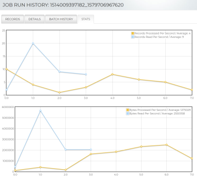 In the figure, the input is tracked as the blue line, the output as yellow. This can help determine the "bottleneck" if the job performance is not as expected. It also shows the bytes per second allowing for the debugging of network throughput issues.