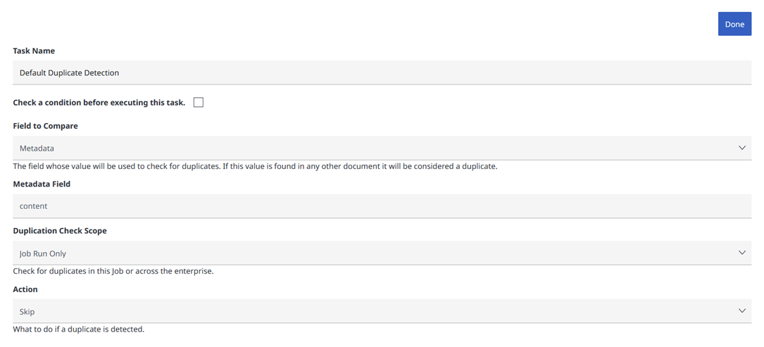If you want to skip, fail or continue a document upon matching any of the duplication detection tasks within a job, you do not need to enable the checkbox Check a condition before executing this task.