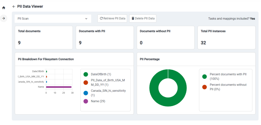 The PII Scan feature allows the user to select a configured repository connector and job, then scan the repository for Personally Identifiable Information (Pii).