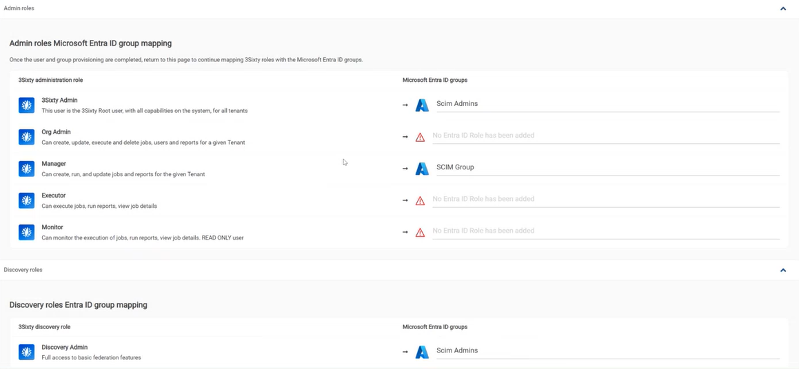 After users and groups are provisioned the next step is to assign roles to the groups according to the access level you want users in that group to have. There must be at least one group mapped to the 3Sixty Admin role and the 3Sixty Discovery Admin role before you can complete the Microsoft Entra ID Authentication setup.