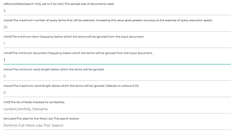 Note: NOTE: These default values are meant to be a starting point, as they require very few matches to be considered like another document. More refined searches will require more tuning.
