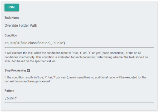 Stop processing, is a boolean field (checkbox) that stops further tasks from being processed if the condition is true.