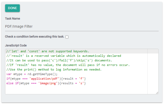 The variable result is automatically declared in each run of the JavaScript task, and its return value can be used to control which documents continue processing.