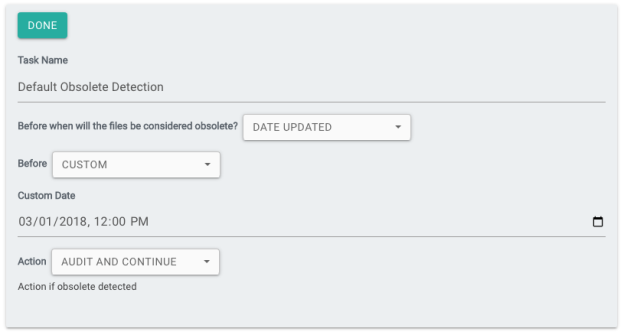 The obsolete detection task can be used to identify obsolete documents when reading them from the source repository. This can be used either in the federation view for identifying documents that are obsolete based on the definition set in the task for the job by adding metadata or skipping/processing the documents which are obsolete. You can define what obsolete means for your organisation - you can define it based on the date created or updated and the content before what time frame is considered as obsolete.