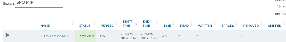This is a completed job. It read 7 files from my SharePoint library and wrote (set as MIP) 7 files to Alfresco. If there are errors, then the number in Errors will show you how many and the cell will be shaded red. If the entire job fails, the Status will be Failed and red instead of completed. You can click the number under Errors to view a list of failed documents and their errors. If the error mentions nodes and needs to check your Alfresco log, the error is at Alfresco/TCSs end and the alfresco.log will need to be pulled.