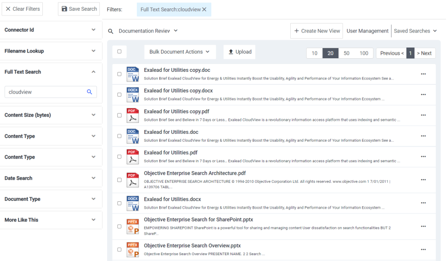 In this example we are searching for the word "cloudview" in the body of the indexed documents. Note that this field is not case sensitive.