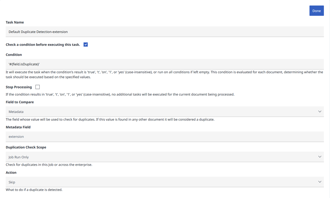 If you want to skip, fail or continue a document upon matching any of the duplication detection tasks within a job, you do not need to enable the checkbox Check a condition before executing this task.
