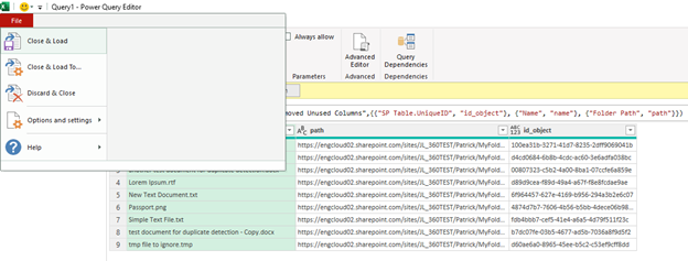 // Connect to SharePoint sitelet// Using SharePoint.Contents API#"Source1" = SharePoint.Contents("https://engcloud02.sharepoint.com/sites/JL_360TEST"),// Navigate to the Library#"Library1" = #"Source1"{[Name="MyLibrary"]}[Content],// Get Files from the Folder#"Folder1" = #"Library1"{[Name="MyFolder"]}[Content],// Add ID Column#"Result1" = Table.AddColumn(#"Folder1", "ID", each [Attributes][Id]),// Using SharePoint.Tables API#"Source2" = SharePoint.Tables("https://engcloud02.sharepoint.com/sites/JL_360TEST", [ApiVersion = 15]),// Navigate to the Library#"Folder2" = #"Source2"{[Title="MyLibrary"]}[Items],// Add UniqueID Column#"Added UniqueID" = Table.AddColumn(#"Folder2", "UniqueID", each [File][UniqueId]),// Add Document Name Column#"Result2" = Table.AddColumn(#"Added UniqueID", "Name", each [File][Name]),// Merge Queries from Source1 and Source2, Left Outer Join on ID field#"Merged Queries" = Table.NestedJoin(#"Result1", {"ID"}, #"Result2", {"Id"}, "SP Table", JoinKind.LeftOuter),// Add UniqueID Column#"Expanded SP Table" = Table.ExpandTableColumn(#"Merged Queries", "SP Table", {"UniqueID"}, {"SP Table.UniqueID"}),// Remove Unused Columns#"Removed Unused Columns" = Table.RemoveColumns(#"Expanded SP Table",{"Content", "Extension", "Date accessed", "Date modified", "Date created", "Attributes", "ID"}),// Rename Columns#"Renamed Columns" = Table.RenameColumns(#"Removed Unused Columns",{{"SP Table.UniqueID", "id_object"}, {"Name", "name"}, {"Folder Path", "path"}})in#"Renamed Columns"Please note: When the document library name includes a space, like 'JL Test,' the space should be removed in the query. However, for the content service connection, the document library name should retain its original format, 'JL Test.'