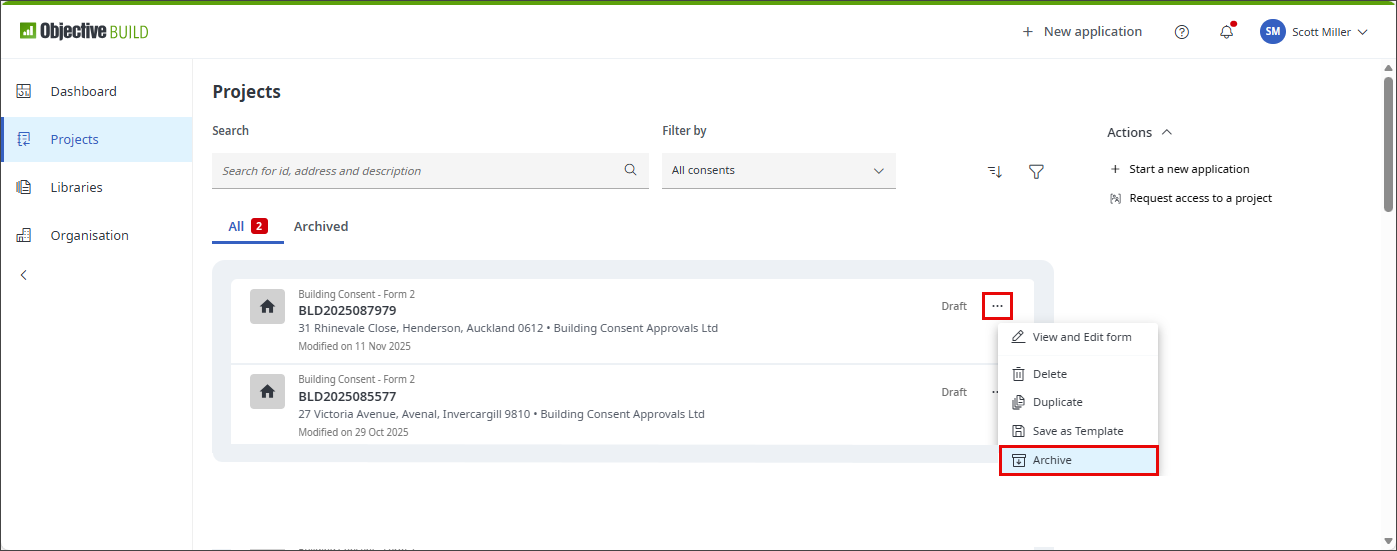 You can archive an application that is in an Accepted or Rejected completed state. You cannot archive an application that is still in a Draft or Lodgement state.