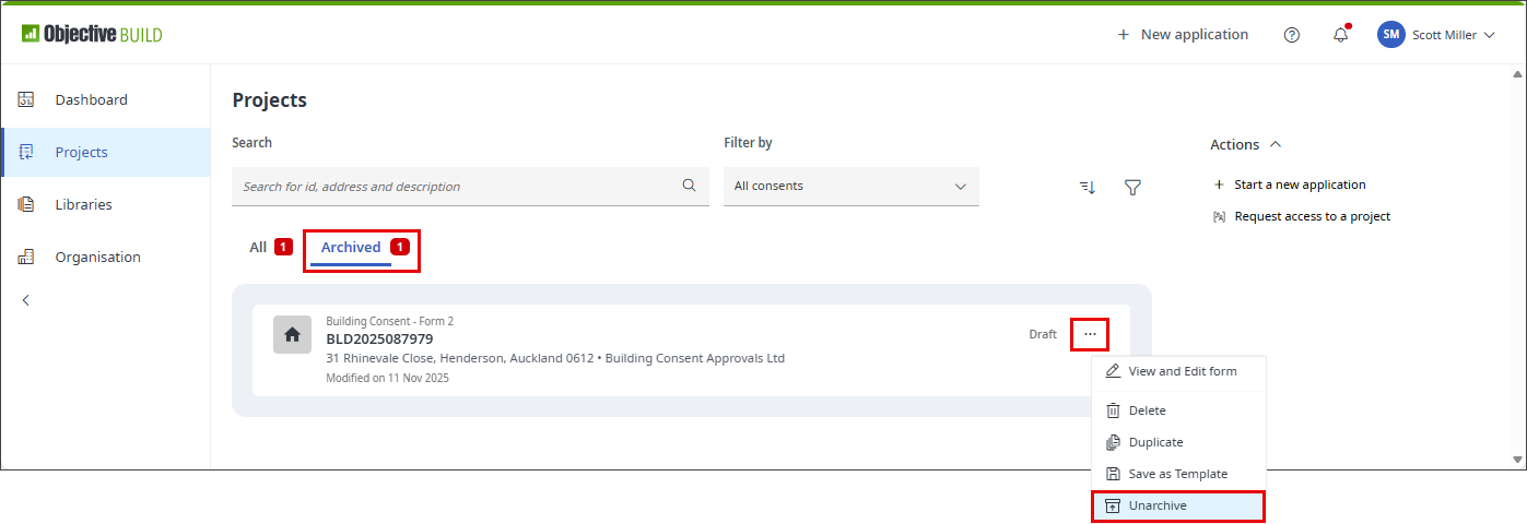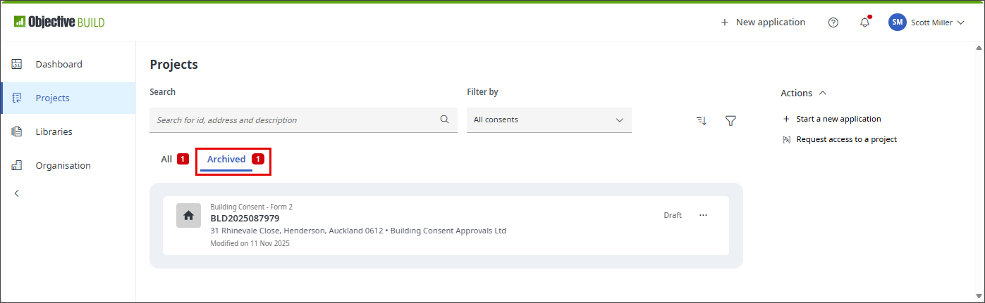 You can see a list of archived applications in the Projects page by selecting the Archived option. You can restore an archived application from this list. This makes the application visible in the All list of the Projects page. It has no effect on the accepted or rejected state of the application or on any of the application's data.