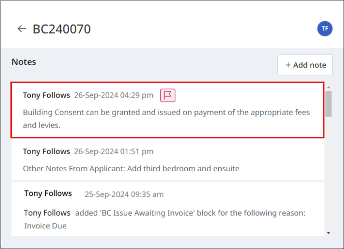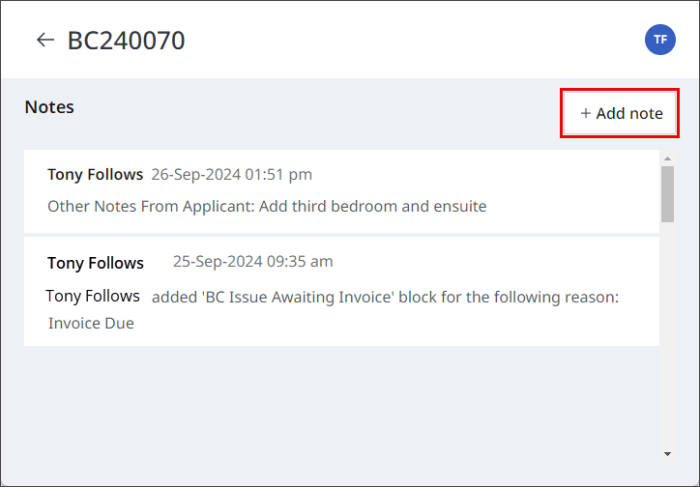 Once the new note has been saved it will be added to the notes for the application