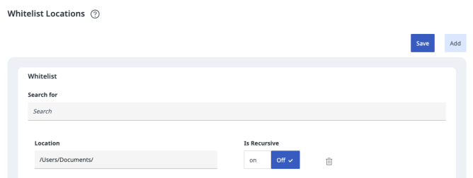 Add: Adds a row to the UI for including a new location to whitelist (Save must be clicked for any changes to be recorded)
