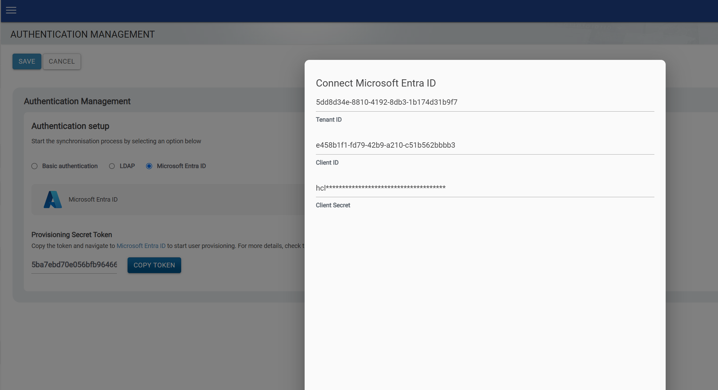 Enter the Tenant ID, Client ID, and Client Secret from step 2