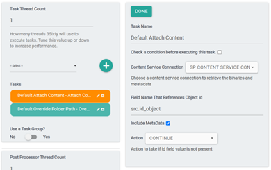 2. Create 2 tasks for this Job. The first task is Default Attach Content. Select the Content Service Connection you created before and specify the field name for the Object Id. Please note: The job configuration in step 4 will be prepending src. to the Field Name.
