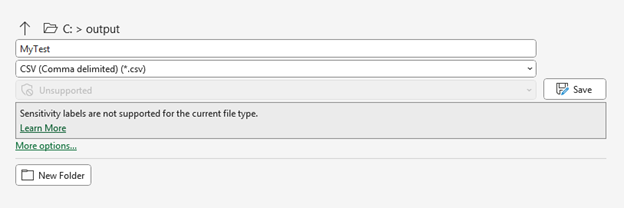 8. On the File tab, select Save As. Type in MyTest as the file name and select CSV (Comma delimited) (*.csv) as the file format. Save this file to the C:\output folder.